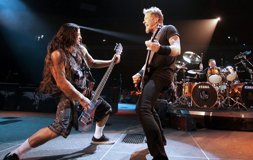 (FILES) In this photograph taken on April 20, 2010, Robert Trujillo (L) bass player and James Hetfield (R), lead singer and guitarist of US rock band Metallica perform during a concert of the «World Magnetic Tour», in Vilnius. US heavy metal outfit Metallica announced on July 12, 2011, on their website that they will rock India with their first-ever show in the country at a concert to mark the inaugural Formula One meeting in October 2011. India are slated to host the Grand Prix on October 30, 2011 at a new USD350 million circuit in Greater Noida on the outskirts of New Delhi. The veteran rockers, famous for numbers like «Nothing Else Matters», will perform at the «F1 Rocks» gig in the satellite town of Gurgaon on October 28 and another show in Bangalore on October 30. AFP PHOTO/PETRAS MALUKAS/FILES