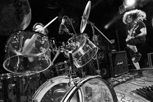 G: Mi guitarra es una Gibson SG, la cual corro por tres amplificadores: dos Quilter de guitarra en estéreo (suenan más o menos como un Marshall JCM, sin el peso en la espalda y lo poco fidedignos que pueden ser los tubos a la hora de irse de gira), y otro Quilter de bajo. Por ese amplificador, corro un Moog Taurus. Es exactamente el mismo setup en vivo. Como dije anteriormente, utilizo todo eso para llenar el espacio sonoro lo más posible, fuera de la percusión, obviamente.