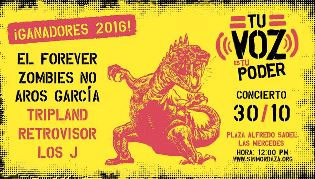 El evento contará con los ganadores del concurso Tu Voz Es Tu Poder, en donde más de 200 bandas y solistas suscribieron sus canciones. El Forever, Zombies No y Aros García serán los artistas que tendrán la oportunidad de compartir tarima con Tomates Fritos, Vinilo Versus, The Red One, Jimmy Flamante, Dj Marco 77, realizado por la organización Un Mundo Sin Mordaza y Redes Ayuda.