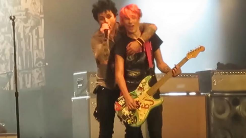 La banda Californiana Green Day durante su concierto en Chicago subió a uno de sus fans, quien los acompaño durante la canción When I Come Around en Chicago (Estados Unidos).