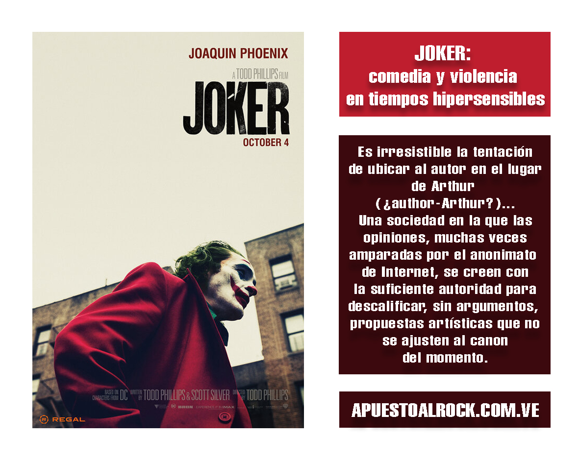 A mes y medio de su estreno mundial, los ríos de tinta que se han vertido sobre Joker (Todd Phillips, 2019), casi no tienen paralelismos en tiempos recientes. Sin embargo, a pesar de todo lo dicho, hay un aspecto no muy tratado: el comentario que este film hace sobre la ficción y la comedia en el actual contexto sociocultural, marcado por la tendencia de la opinión pública hacia la extrema corrección política y la evitación de contenidos ambiguos, amorales o problemáticos.